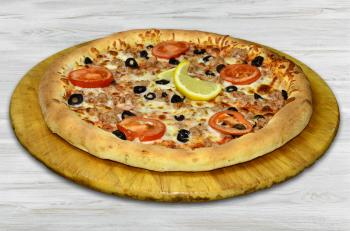 ((pizzaszósz, tonhal, fekete olívabogyó, citrom karika, paradicsom, mozzarella)